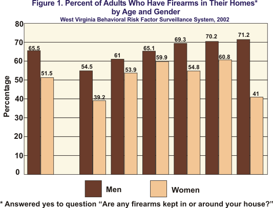 Of those BRFSS respondents having firearms in or around their homes, 16.3% reported that these weapons were loaded, 21.4% of men and 10.5% of women. Both men and women aged 45 and older were more likely than those aged 18-44 to keep firearms loaded. When respondents with loaded firearms were asked if any of the loaded firearms they possessed were also unlocked, 57.0% of men and 61.0% of women answered yes. Youth. The percentage of students in grades 9 through 12 who carried a gun on one or more of the past 30 days as measured by the YRBSS survey declined steadily from 1993 to 1999, both nationally and in West Virginia, but then increased according to the 2001 (United States) and 2003 (United States and West Virginia) survey results (Table 4). Consistently higher rates of state students reported having carried a gun than their national peers in every year of the survey. Male students were much more likely to have carried a gun than female students both state- and nationwide. In 2003, nearly one in five (18.6%) male students in West Virginia reported having carried a gun in the past month, compared with 2.1% of female students.