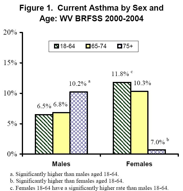 During the period 2000-2004, West Virginia females had a significantly higher prevalence of current asthma than males. In fact, females reported a significantly higher prevalence than males at ages 25-34, 35-44, 45-54, and 55-64. Elderly females did not have a significantly higher prevalence of current asthma than elderly males (8.7% versus 8.0%) (see Table 1).