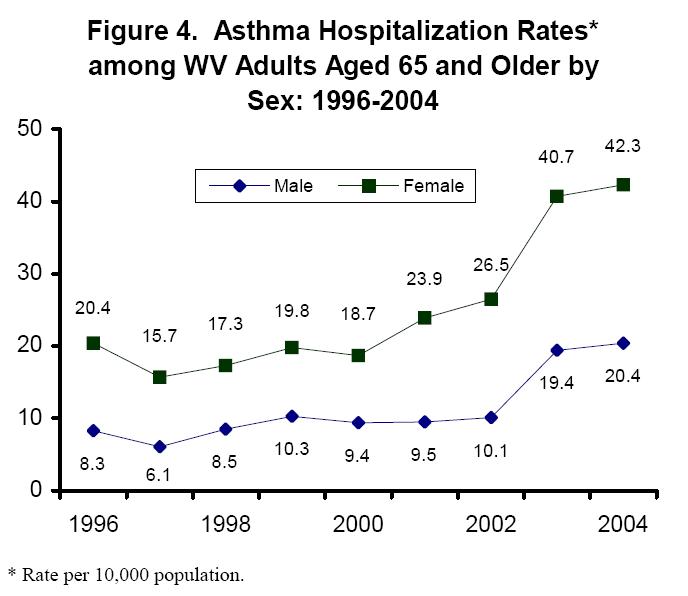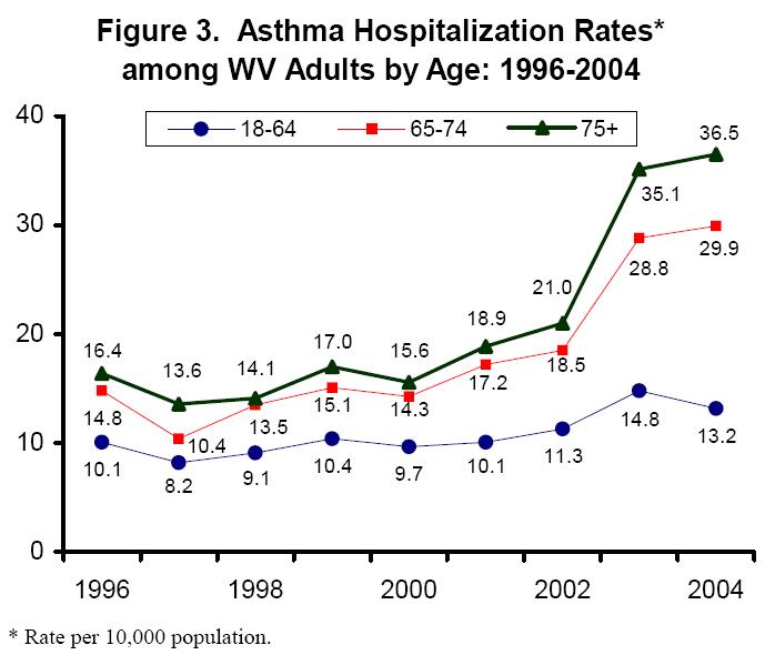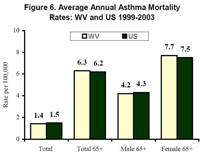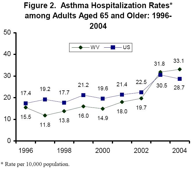 In addition, in 2003 and 2004, the rate of asthma hospitalizations among adults aged 65 and older was higher in West Virginia than the United States. Despite an increase in the asthma prevalence and hospitalization rate, West Virginia elderly maintained a slightly lower rate of asthma mortality than elderly adults nationwide for the years 1999-2003.