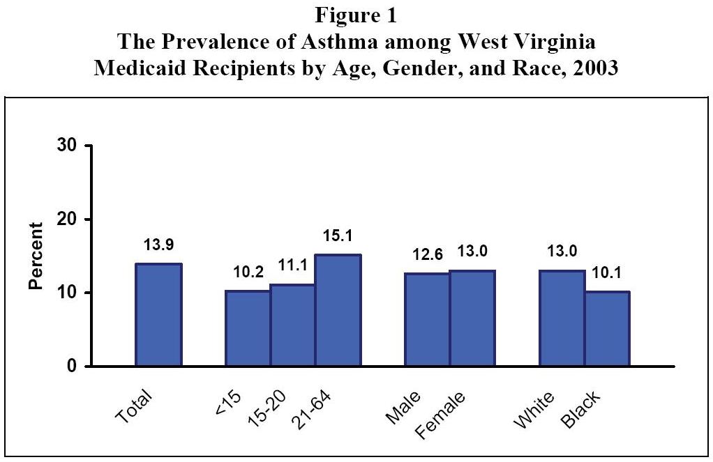 West Virginia public health programs are working to reduce socioeconomic disparities related to chronic disease and access to health care. The first step is to identify and understand the burden of disease among West Virginians of low socioeconomic status. Therefore, the West Virginia Asthma Education and Prevention Program funded a project headed by Michael Smith, Ph.D., R.Ph., at the West Virginia University School of Pharmacy to analyze 2003 West Virginia Medicaid claims data to determine: 1) the prevalence of asthma in the West Virginia Medicaid population, 2) asthma-related medical services and prescription utilization among Medicaid recipients, and 3) the amount reimbursed for asthma-related services and prescriptions by West Virginia Medicaid. It is important to note that the methodology used in this report may overestimate the prevalence of asthma and asthma-related medical service visits and reimbursements. See the Appendix for a discussion of the study methodology and for detailed data tables.