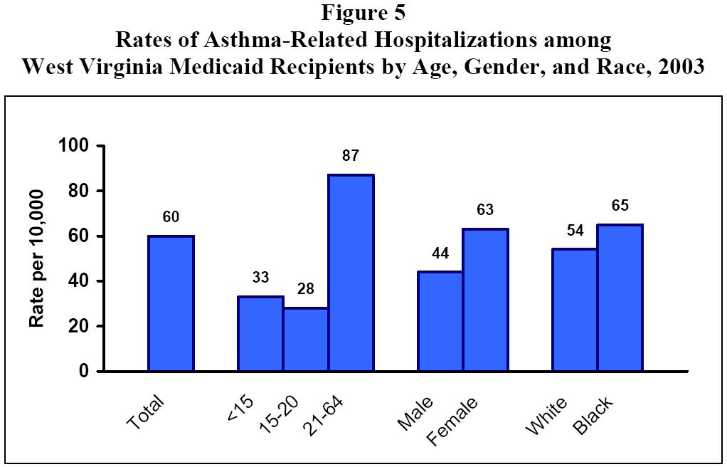 The West Virginia Medicaid program provides health care coverage to low-income adults and children. Medicaid recipients are of particular interest to public health programs because many health conditions, including asthma, are inversely associated with socioeconomic indicators such as income. That is, individuals with low levels of income are more likely to have chronic health conditions. In fact, the prevalence of asthma is more than 2.5 times higher among West Virginia adults with an annual income less than $25,000 than among those with an income of $50,000 or more (14.1% vs. 5.4%) (Source: 2003-2005 Behavioral Risk Factor Survey).