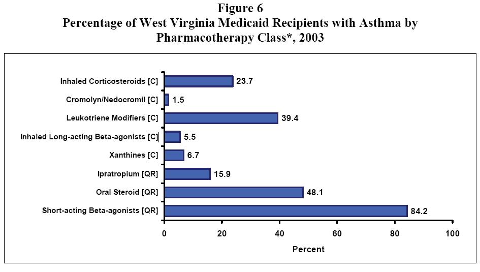 In 2003, there were 16,978 West Virginia Medicaid recipients who had a medical service claim with a primary or secondary diagnosis of asthma who also had at least one prescription claim for an asthma-related medication. These recipients had a total of 137,420 prescription claims for asthma-related medications – an average of 8.1 claims per recipient with asthma (defined as having had an asthma-related medical service claim and an asthma-related prescription claim).